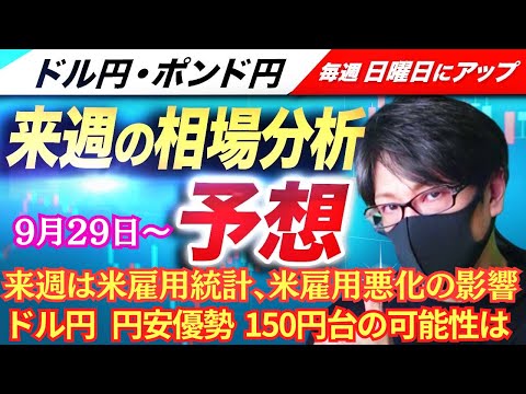 09/28 07:00に「【FX初心者におすすめ】スキャトレふうた FX大学」さんによって公開された「【FX来週の相場分析と予想】ドル円、円安優勢150円台突入の可能性!?米雇用悪化で米雇用統計、ADP雇用統計、自民党総裁選、スキャルピング!ドル円・ポンド円、週間為替展望(9月29日~10月3日)」の動画