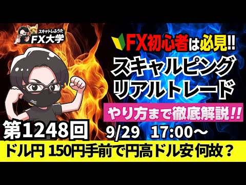 09/29 10:07に「【FX初心者におすすめ】スキャトレふうた FX大学」さんによって公開された「【FXライブ配信】リアルトレード解説、第1248回、ドル円150円手前で円高 ドル安、米連邦政府機関閉鎖警戒のドル売り、リスク警戒の動き|デイトレ・スキャルピング|ドル円・ポンド円相場分析と予想」の動画