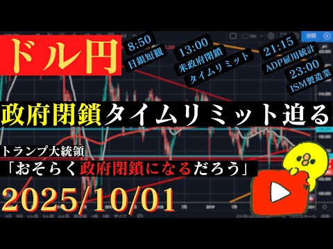 【ドル円】米政府閉鎖のタイムリミット迫る‼トランプ大統領も閉鎖を示唆🐥2025/10/1🐥