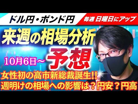 10/05 07:00に「【FX初心者におすすめ】スキャトレふうた FX大学」さんによって公開された「【FX来週の相場分析と予想】自民党総裁選、高市新総裁、史上初の女性首相!週明けの相場への影響は?デイトレ・スキャルピング!ドル円・ポンド円、週間為替展望(10月6日~10月10日)」の動画