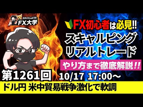 10/17 10:09に「【FX初心者におすすめ】スキャトレふうた FX大学」さんによって公開された「【FXライブ配信】リアルトレード解説、第1261回、米中貿易戦争が激化、ドル円軟調、高市トレード終了!自民・維新の連立政権は!?|デイトレ・スキャルピング|ドル円・ポンド円相場分析と予想」の動画