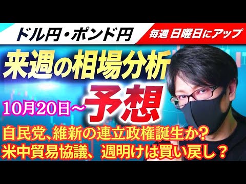 10/19 07:00に「【FX初心者におすすめ】スキャトレふうた FX大学」さんによって公開された「【FX来週の相場分析と予想】米中貿易協議、自民党、維新の連立政権誕生か?高市トレードの復活は?相場への影響!デイトレ・スキャルピング!ドル円・ポンド円、週間為替展望(10月20日~10月24日)」の動画