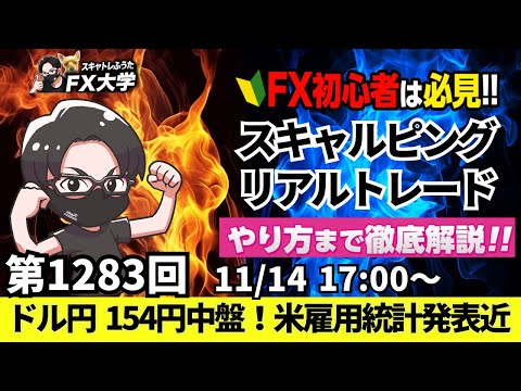 11/14 10:10に「【FX初心者におすすめ】スキャトレふうた FX大学」さんによって公開された「【FXライブ配信】ドル円リアルトレード解説、米雇用統計発表近い!米指標発表に注目!米利下げ観測が後退、米株急落、為替介入は?|デイトレ・スキャルピング|ドル円・ポンド円相場分析と予想【第1283回】」の動画