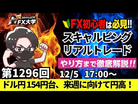 12/05 09:44に「【FX初心者におすすめ】スキャトレふうた FX大学」さんによって公開された「【FXライブ配信】リアルトレード解説、第1296回、ドル円154円台!12月日銀利上げ観測、利上げ継続姿勢、米国は利下げで日米金利差縮小へ|デイトレ・スキャルピング|ドル円・ポンド円相場分析と予想」の動画
